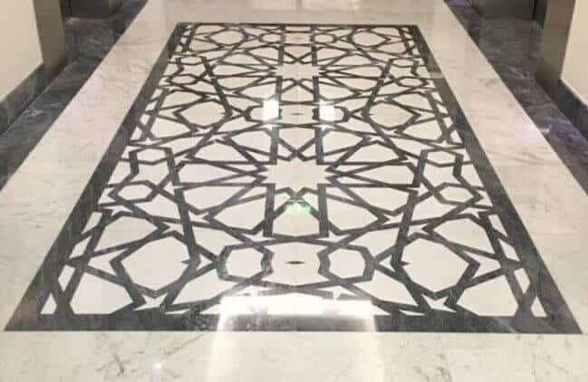 Mosaico realizado Waterjet: Combinación Gris Rubina y Volakas. Proyecto realizado por Albora