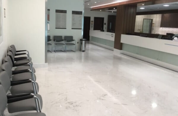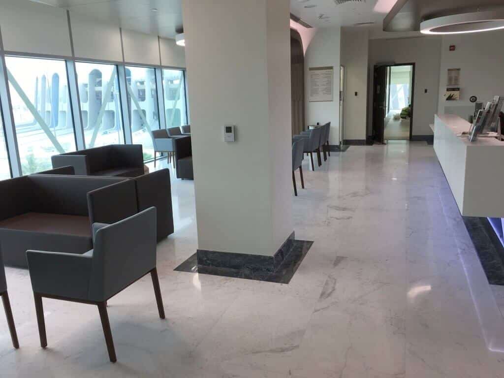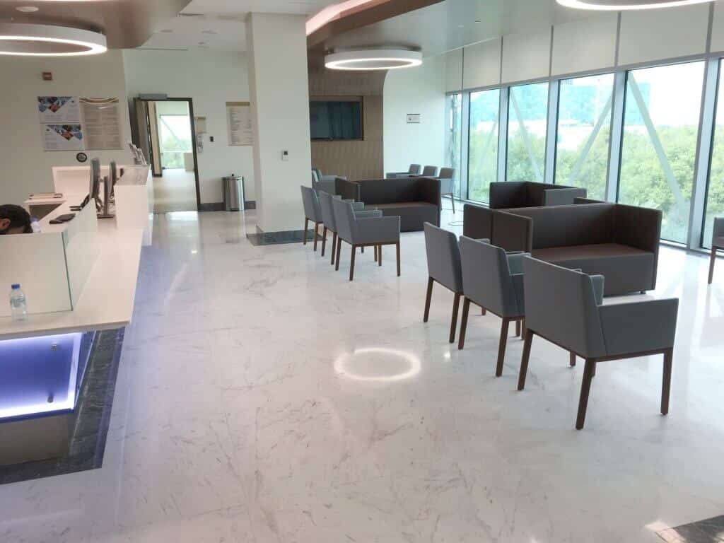 Vista Frontal ADGM, Abu Dhabi. Pared y mostradores recubiertos por Blanco Statuario. Proyecto realizado por Albora